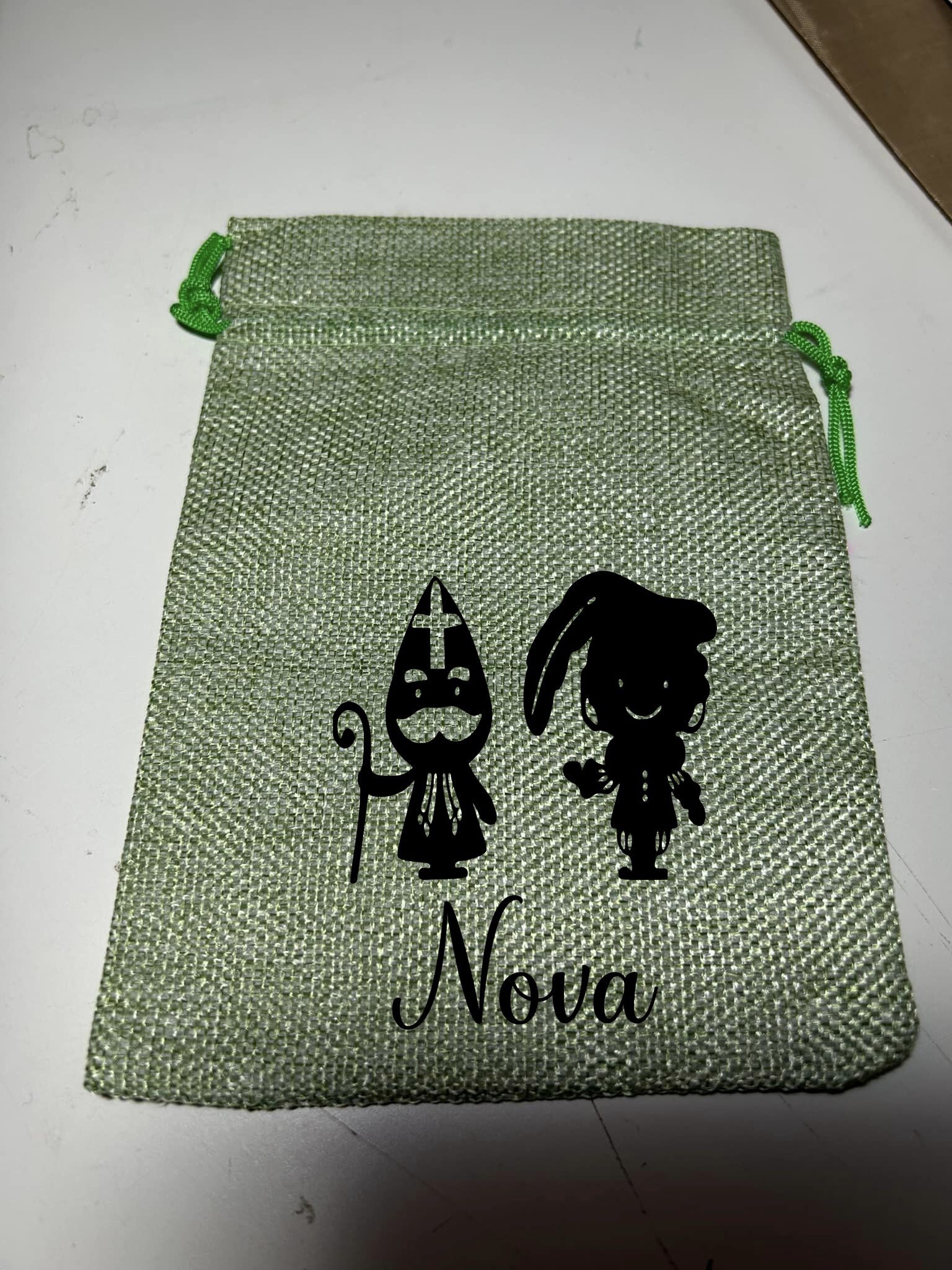 Superleuke “jute” pepernoten zakjes met naam. Handig voor tijdens de intocht of leuk voor een klein cadeautje in de schoen.