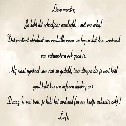 Deze mooie armband van natuursteen is het perfecte cadeau na een jaar vol geduld, energie en wijze lessen.