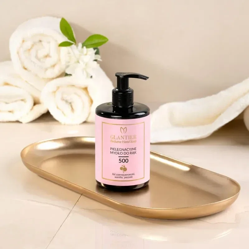 De rijke, olieachtige textuur schuimt licht, spoelt moeiteloos af en laat geen trekkerig gevoel achter. De elegante geur van Glantier 500 – met tonen van zwartbessensblad, vanille en patchouli – omhult je handen en blijft subtiel aanwezig.